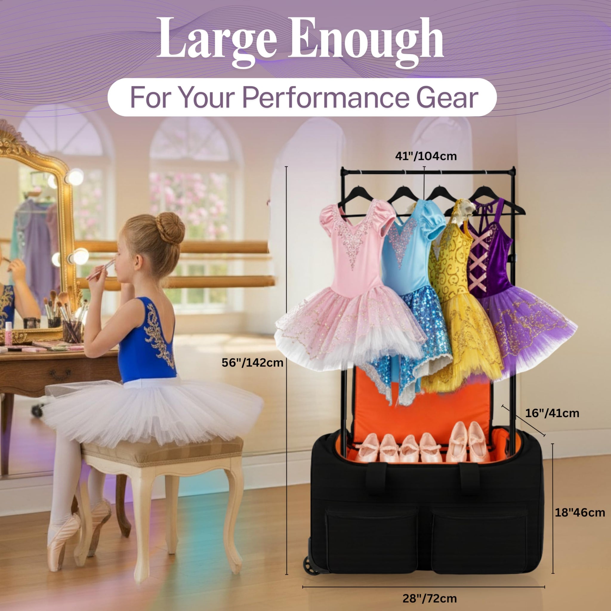 ALL-IN-ONE STORAGE FOR PERFORMERS: Premium Brands Quality yet Affordable. Stay organized on the go with our dance travel bag. It features a built-in collapsible garment rack with locking side rods, an adjustable telescopic handle, and smooth-rolling wheels. Perfect for quick costume changes at events, competitions, and dance conventions.