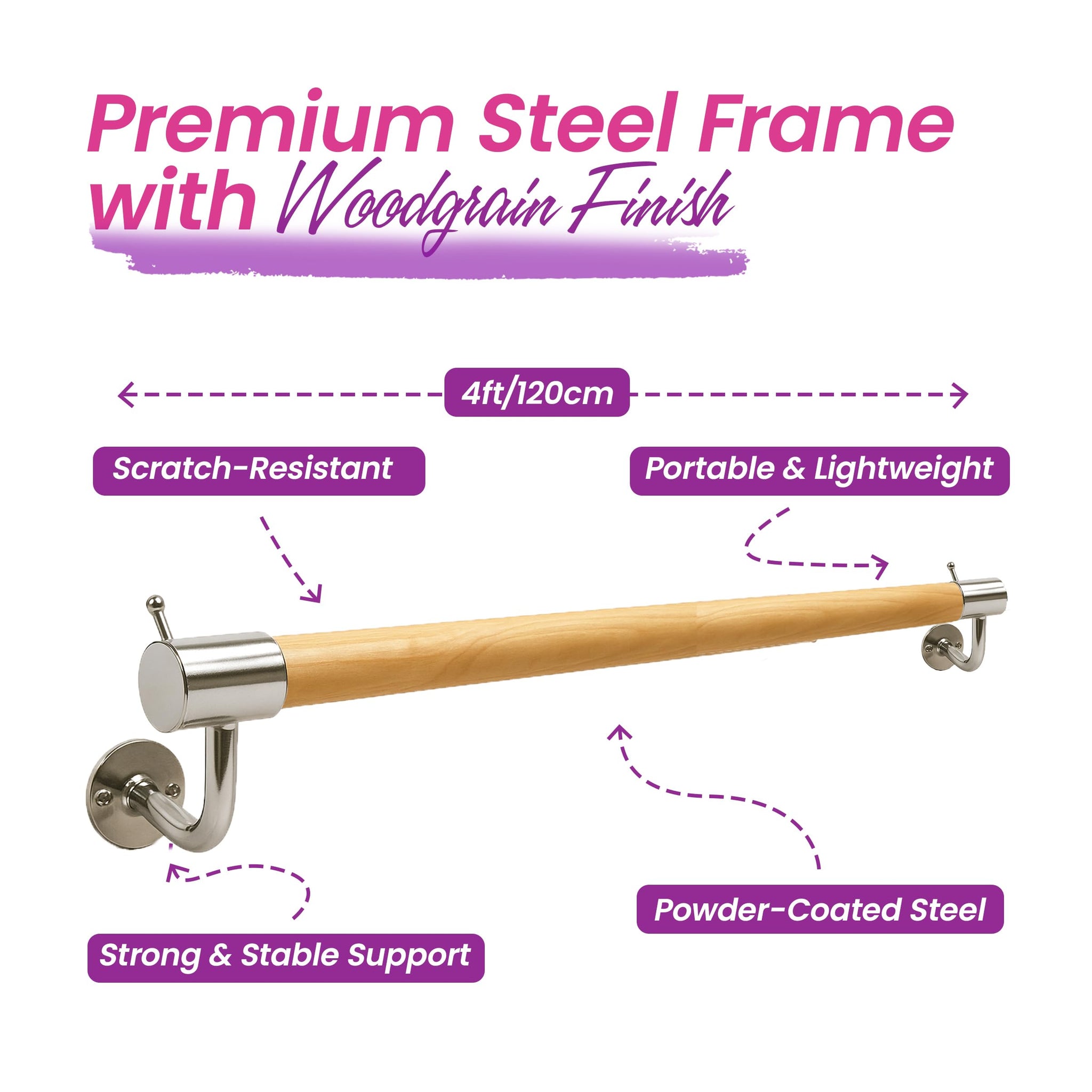 Stylish and Durable: Made of powder-coated steel tubes with a scratch-resistant frame and a classic woodgrain look, our handrail offers both style and durability.