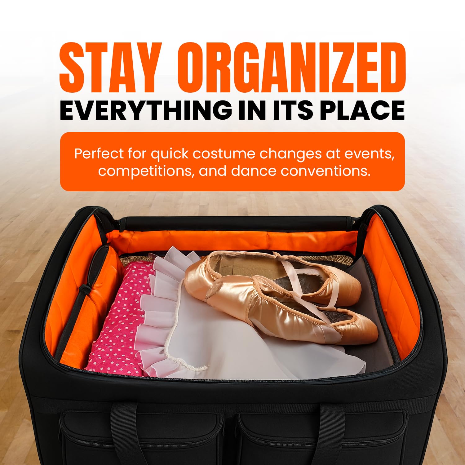VERSATILE FOR ALL PERFORMERS: More than just a dance bag with wheels, this rolling bag is ideal for competitive t dancers, cheerleaders, figure skaters, theater performers, athletes, models, and live streamers who need a portable wardrobe on wheels.