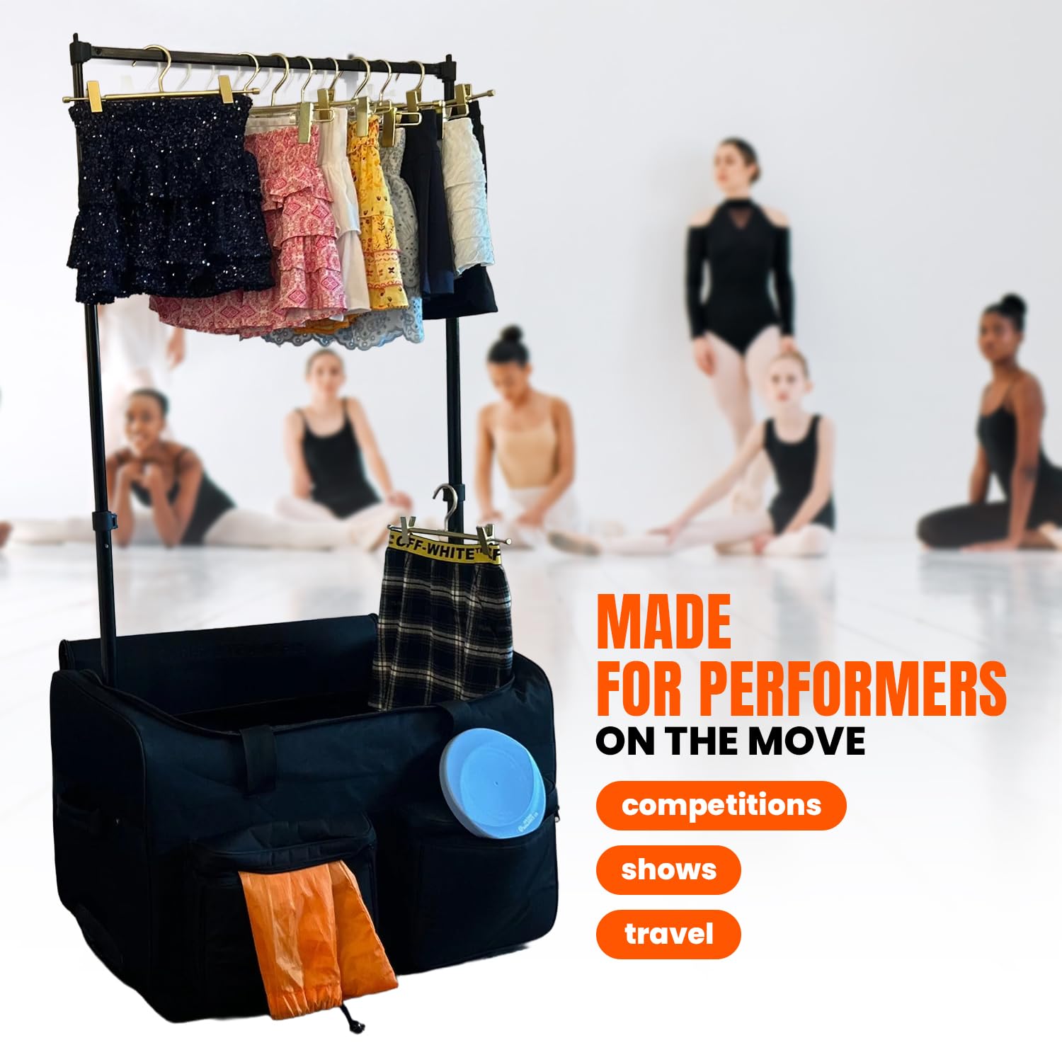 ALL-IN-ONE STORAGE FOR PERFORMERS: Premium Brands Quality yet Affordable. Stay organized on the go with our dance travel bag. It features a built-in collapsible garment rack with locking side rods, an adjustable telescopic handle, and smooth-rolling wheels. Perfect for quick costume changes at events, competitions, and dance conventions.