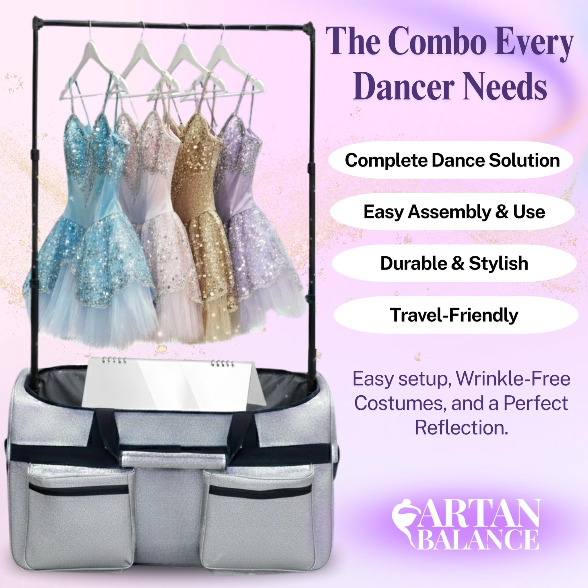 ALL-IN-ONE STORAGE FOR PERFORMERS: Stay organized on the go with our dance travel bag. It features a built-in collapsible garment rack with locking side rods, an adjustable telescopic handle, and smooth-rolling wheels. Perfect for quick costume changes at events, competitions, and dance conventions.